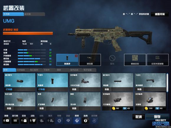 与短剑基础性能几乎是相反的存在,cod6中的ump45则是暴力的多了。630rpm的射速为冲锋枪最低,甚至不如一般的长枪。弹匣容量32发,不过亮点是40-35的爆表威力,传说中无论多远,只要打中三枪就毙命的武器。也因为这个原因,ump45一直被人所诟病,被称为六代中的noob神器之一。ump45也非常适合加消音,不过ump的后坐力较为大,加上消音之后抖动比较明显。