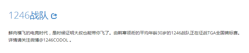 “鲜肉横飞的电竞时代,是时候证明大叔也能带你飞了。由韩寒领衔的平均年龄30岁的1246战队正在征战TGA全国锦标赛。”