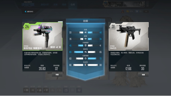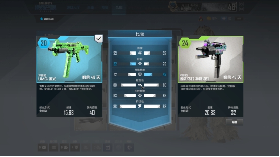 如果说UZI系列冲锋枪是冲锋与射速的结合,那么UMG系列则是稳定与射速完美融合。从数据对比中我们可以看到UZI神秘海洋射速高弹容低,而UMG流光则是弹容高射速低。从这数据的差异上我们可以看到UZI神秘海洋在近距离还是会吊打UMG流光,但同样作为三配件的武器,UMG流光因为本身射速稍慢,毕竟容易控制在配上握把之后在中距离可能就会完全胜出了。