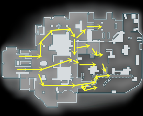 速攻A,玩家可以根据以下的路线直接进攻A包点,直接从候机大厅前往A点,掩体众多,玩家可以长枪卡点,短枪突袭的形式进攻A点。要小心的是不要让敌人先行占领制高点,中路的突进玩家可以直接上平台控制住A点周围的局势。