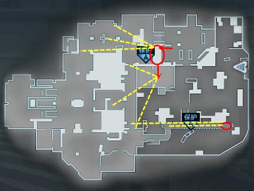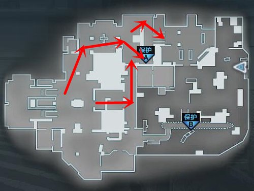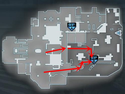 速攻B,玩家可以按照以下的路线速攻B包点,直接从复活点右侧进入客机机头,最好有一名防爆盾顶在前面,其他队友跟在后面,防止被狙射死。