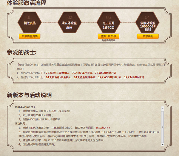 2.欢迎各位拥有体验服资格的精英战士加入我们核心玩家群:核心1群:314386126.2群:314386193.3群:314386381同其他玩家进行交流互动,遇到bug等问题请向群管理员反馈;同时,群内将不定期举办群活动,仅限群成员参加。