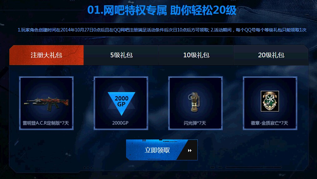 活动期间凡是在2014年10月27日0点后于QQ网吧创建游戏角色的玩家,即可领取“注册大礼包”,内含“雷明登A.C.R定制版*7天”、“2000GP”、“闪光弹*7天”以及“徽章-金质寂忘*7天”。活动期间,玩家达到相应等级还可领取等级礼包、游戏人生专属荣誉纪念徽章以及游戏内专属网吧称号、背景名片、专属徽章一套;“M4A1-Tech*7天”、“AK117-定制版*30天”、“角色-约翰*30天”以及众多GP等待玩家前来收入囊中,助玩家轻松升到20级。除上述福利之外,玩家通过每天登录活动页面,即可获得抽奖机会,Q币、“141纪念勋章”、“角色-弗拉基米尔*30天”等超值好礼等待玩家前来抽取。