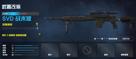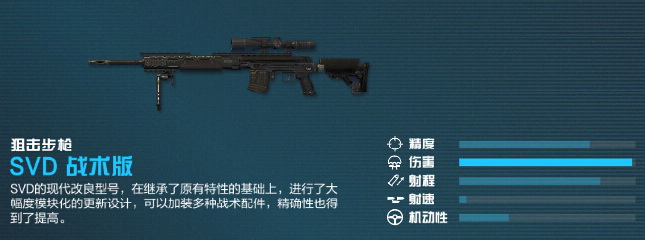 终于又有新狙击枪加入CODOL中了,而且是大名鼎鼎的SVD现代改良版。战术版SVD是半自动狙击枪,也就是玩家们所说的连狙。拥有两个配件槽,可选配件与其他狙击步枪基本一致。